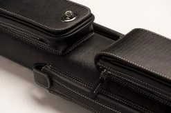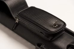 Die Hustler-Köcher gibt es in den Varianten 2/2 (2 Unter- und 2 Oberteile), 2/4 und 3/5. Alle Modelle haben eine Seitentasche für das Unterteil eines Jump-Queues. Zwei weitere großzügige Seitenaschen fassen Ihr komplettes Billardzubehör. Die Köcher sind in den Farben schwarz und braun verfügbar. Das Obermaterial ist ein sehr feines Kunstleder mit Schlangenleder-Prägung. Was man dem Köcher ebenfalls auf den ersten Blick ansieht, ist seine sehr stabile und saubere Verarbeitung mit extra starken Nähten und Verstärkungen an allen kritischen Stellen eines Queue-Köchers. Somit haben Sie sowohl an Ihrem Queue als auch an dem Köcher lange Freude.