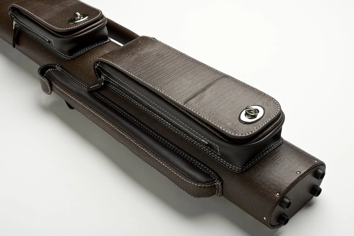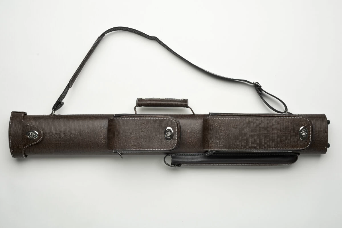 Die Hustler-Köcher gibt es in den Varianten 2/2 (2 Unter- und 2 Oberteile), 2/4 und 3/5. Alle Modelle haben eine Seitentasche für das Unterteil eines Jump-Queues. Zwei weitere großzügige Seitenaschen fassen Ihr komplettes Billardzubehör. Die Köcher sind in den Farben schwarz und braun verfügbar. Das Obermaterial ist ein sehr feines Kunstleder mit Schlangenleder-Prägung. Was man dem Köcher ebenfalls auf den ersten Blick ansieht, ist seine sehr stabile und saubere Verarbeitung mit extra starken Nähten und Verstärkungen an allen kritischen Stellen eines Queue-Köchers. Somit haben Sie sowohl an Ihrem Queue als auch an dem Köcher lange Freude.