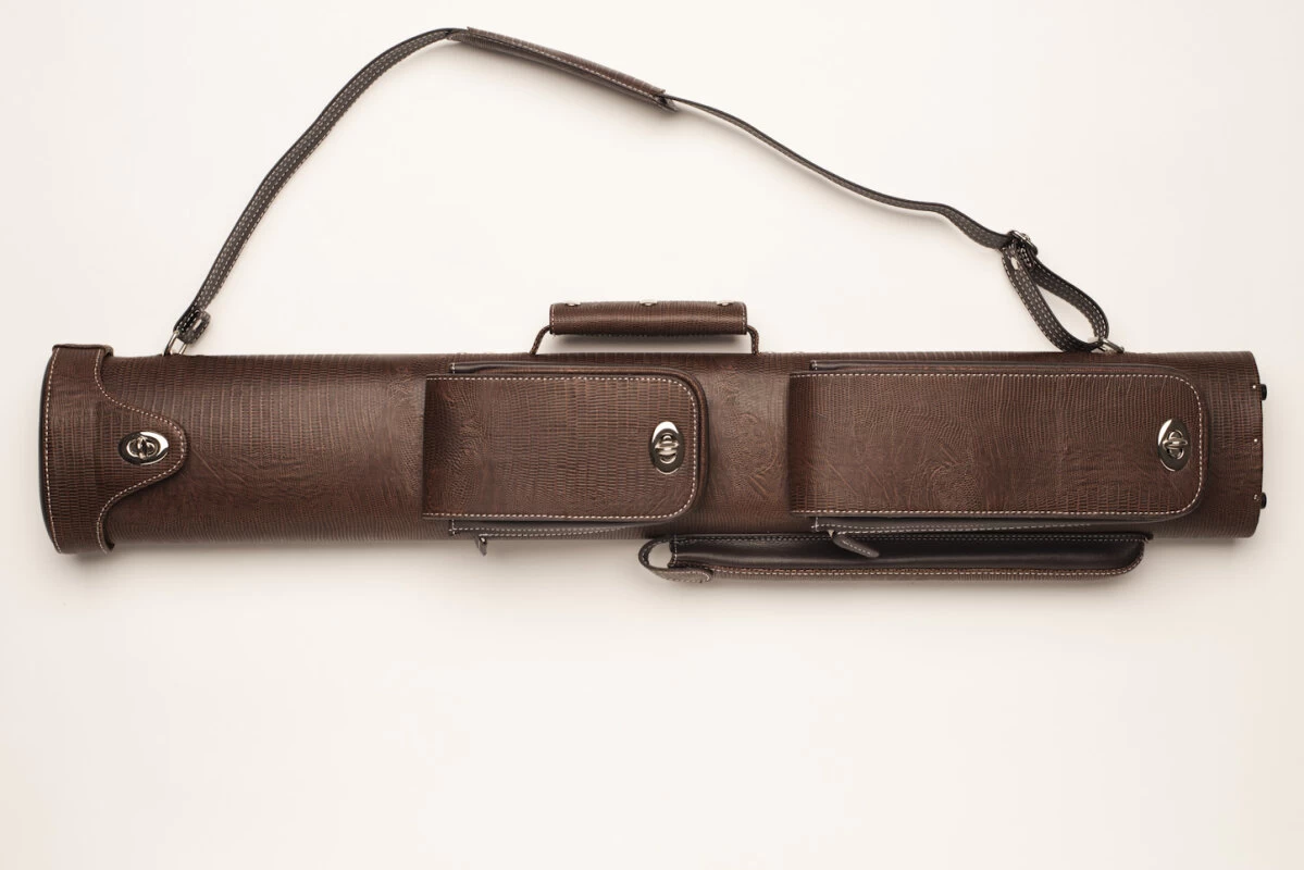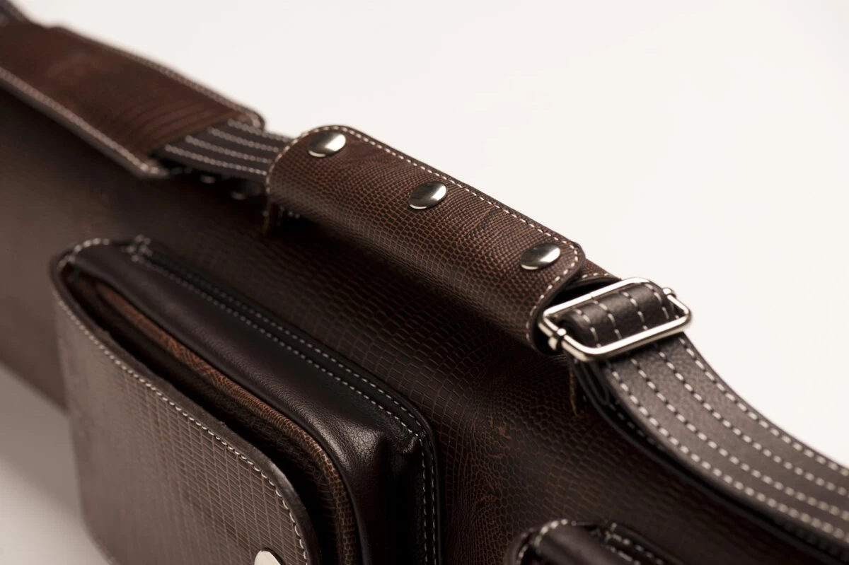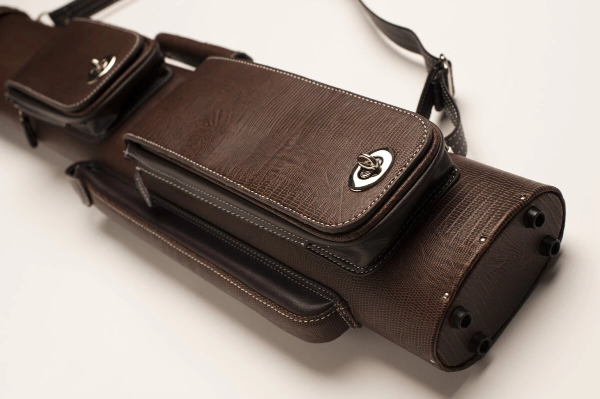 Die Hustler-Köcher gibt es in den Varianten 2/2 (2 Unter- und 2 Oberteile), 2/4 und 3/5. Alle Modelle haben eine Seitentasche für das Unterteil eines Jump-Queues. Zwei weitere großzügige Seitenaschen fassen Ihr komplettes Billardzubehör. Die Köcher sind in den Farben schwarz und braun verfügbar. Das Obermaterial ist ein sehr feines Kunstleder mit Schlangenleder-Prägung. Was man dem Köcher ebenfalls auf den ersten Blick ansieht, ist seine sehr stabile und saubere Verarbeitung mit extra starken Nähten und Verstärkungen an allen kritischen Stellen eines Queue-Köchers. Somit haben Sie sowohl an Ihrem Queue als auch an dem Köcher lange Freude.
