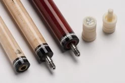 In der DBJ-Reihe finden sich hochwertige Break-/Jump-Queues zum hervorragenden Preis. Die Modelle sind entweder aus Palisander oder Zebrano-Holz gefertigt und mit vier echten, eingelegten Points aus Ahorn verziert. An den Gewinden und am Butt wird das Queue von schönen Zierringen veredelt. Break-/Jump-Queues vereinen ein Break-Queue für den Anstoß und ein Jump-Queue für Jump-Shots in einem Queue und sorgen damit für mehr Platz im Queue-Köcher. Die DBJ-Queues verfügen über eine Kunststoff-Ferrule und eine G10-Pommeranze. Das Break wird kraftvoller und Jump-Shots sind einfacher auszuführen. Zwei rostfreie 3/8×6-Gewinde ermöglichen eine leichte Teilung des Queues für kurze oder lange Jumpshots. Zum Schutz des Gewindes gibt es ein paar Gewindeschoner zu jedem Break-/Jump-Queue mit dazu.