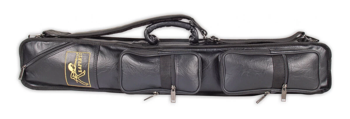 Die schwarze Laperti Billard-Queuetasche Tournament bietet Platz für vier Unter- und acht Oberteile (4/8). Die Tasche kommt ist aus hochwertigem Kunstleder gefertigt und ist innen mit Filz ausgepolstert, sodass die Queues bestens geschützt sind. Fünf Außentaschen in verschiedenen Größen bieten Platz für Zubehör wie Billardkreide, Billardhandschuhe oder Queue-Werkzeug. Tragen lässt sich die Queuetasche entweder per Tragegriff oder mit dem praktischen gepolsterten Schultergurt.