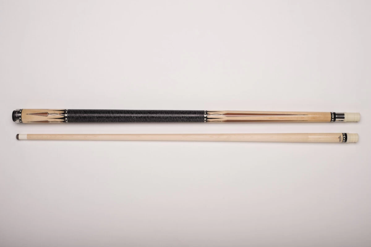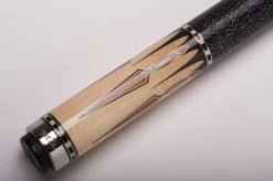 Sehr schönes, traditionelles Design mit Einlegeoptik im Perlmuttdesign. Das Design wird mit einer Folie geklebt und überlackiert; so entsteht die Optik von hochwertigen Einlegearbeiten. Die schönen Zierringe am Griffband und am Gewinde veredeln das Erscheinungsbild zusätzlich. Wir haben hier eine zuverlässige 3/8-10-Verschraubung mit Holzgewinde für beste Kraftübertragung beim Stoß. Das Griffband besteht aus einer Leinenwicklung aus irischem Leinen. Bei diesem Modell wurde eine Ferrule japanischer Herstellung verarbeitet und mit einem Triangle-Qualitätsleder versehen. Rostfreies Metall am Ende des Queues macht den besonderen Eindruck komplett. Lieferung inkl. Gewindeschoner zum Schutz Ihres Queues.