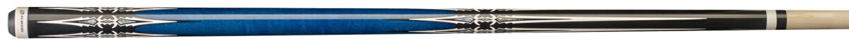 Klassisches Queue aus kobaltblau gebeiztem Vogelaugen-Ahorn mit perlmuttverziertem Dolchmotiv vorne und hinten und schwarz-weiĂem Gewindekragen. 5/16×18-Gewinde mit Implex-Joint, ohne Griffband.