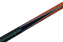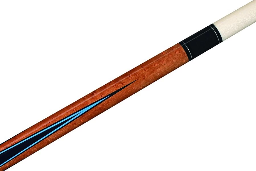 Antik gebeiztes Queue aus Vogelaugen-Ahorn mit nachtschwarzen und türkisen Akzenten. Versehen mit einem Griffband aus doppelt gepresstem irischen Leinen in schwarz/türkis und dem neuen HXT-Low-Deflection-Oberteil.