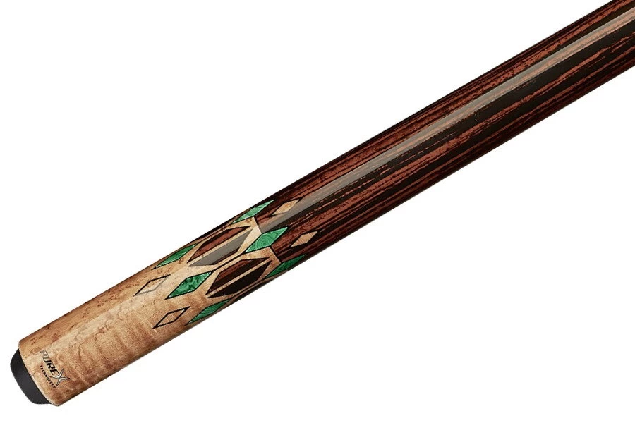 Golden gebeiztes Queue im antiken Look aus Vogelaugen-Ahorn mit verzierenden Designarbeiten in grĂŒn. Ohne Griffband und mit dem neuen HXT-Low-Deflection-Oberteil.