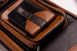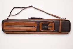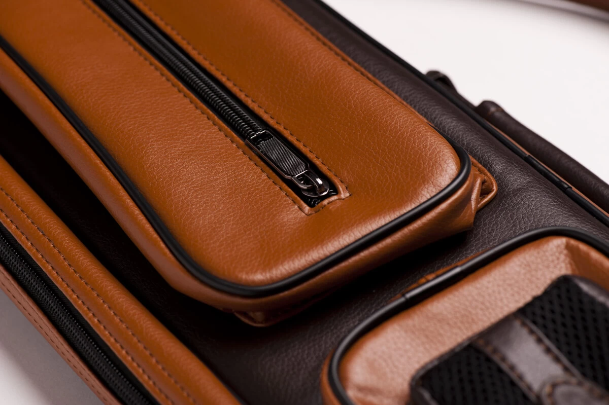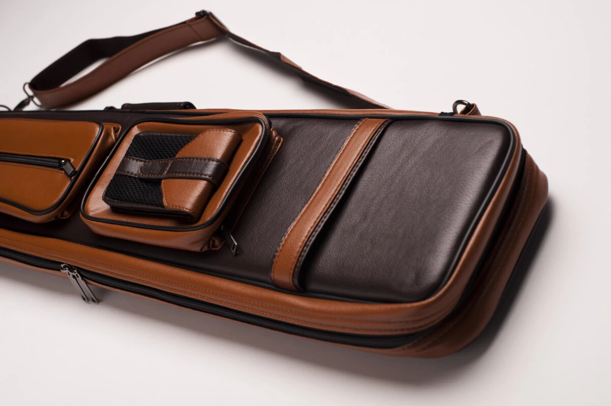 Wer hier an die 70er-Jahre denkt, liegt richtig. Klassisches Design meets Billardtasche mit dem hellbraunen und dunkelbraunen Kunstleder. FĂŒr 2 Unter- und 4 Oberteile, dank der flexiblen Schuberaufteilung aber auch anders kombinierbar. In die Seitentaschen passt etliches Zubehör, in die lĂ€ngere Seitentasche auch das Unterteil eines Jump-Queues. Queuetaschen haben den Vorteil, dass sie deutlich leichter sind als Köcher, was der eine oder andere bevorzugt. Mit verstellbarem Schultergurt und zwei Tragegriffen.