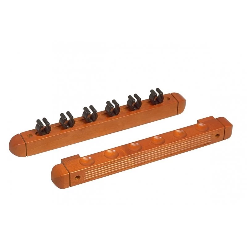 Diese einfache, aber schöne Wandhalterung für Queues darf in keinem Billardzimmer fehlen. Es fasst bis zu sechs Queues und ist auch für Billardsalons als günstige Wandbefestigung geeignet. Das untere Teil hat Vertiefungen für das untere der Queues, das obere Teil hat Klammern aus Kunststoff, die das Queue sicher halten. Einfach mit Schrauben und Dübeln an der Wand zu befestigen. Für Queues aller Spielarten geeignet.