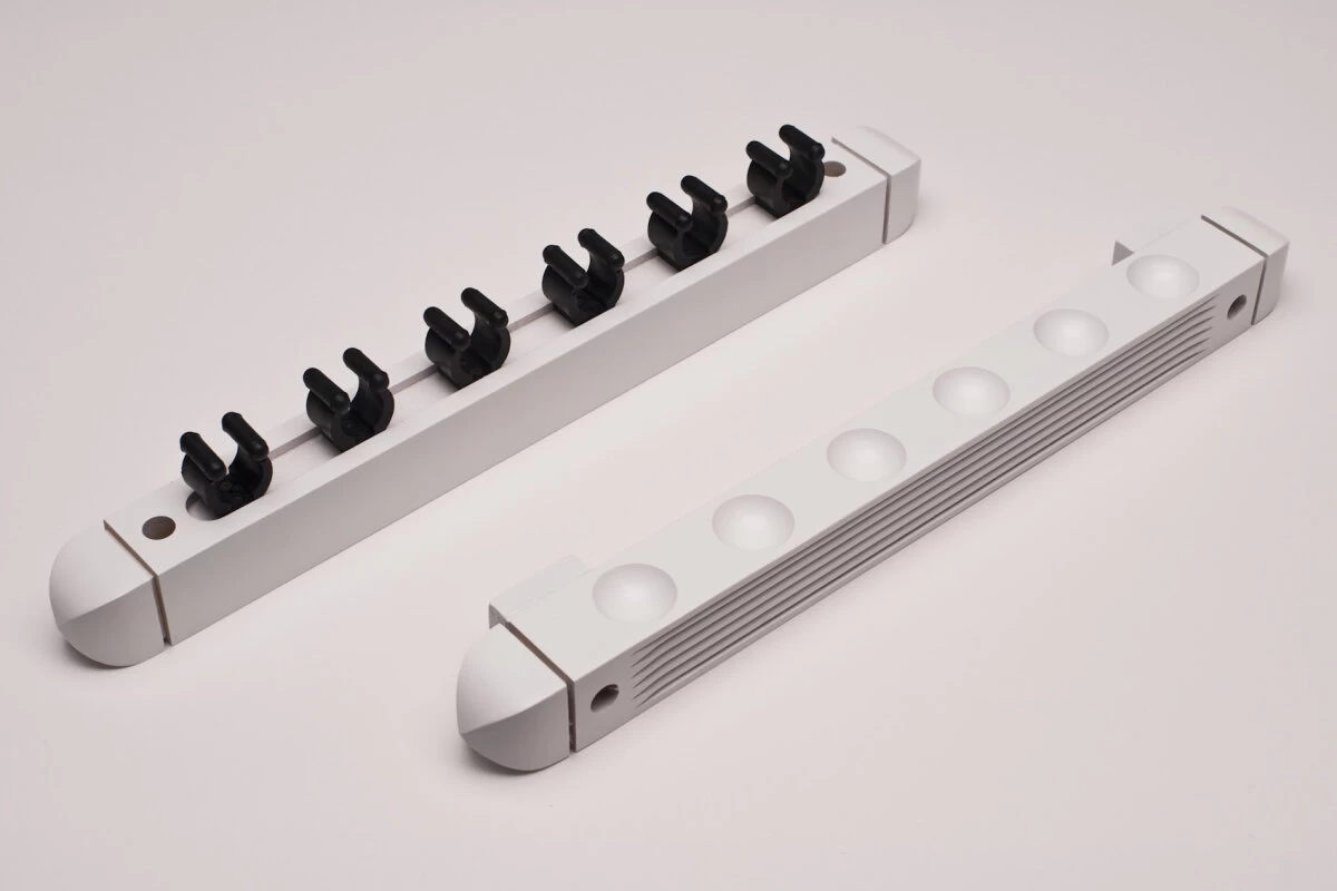 Diese einfache, aber schöne Wandhalterung für Queues darf in keinem Billardzimmer fehlen. Es fasst bis zu sechs Queues und ist auch für Billardsalons als günstige Wandbefestigung geeignet. Das untere Teil hat Vertiefungen für das untere der Queues, das obere Teil hat Klammern aus Kunststoff, die das Queue sicher halten. Einfach mit Schrauben und Dübeln an der Wand zu befestigen. Für Queues aller Spielarten geeignet.