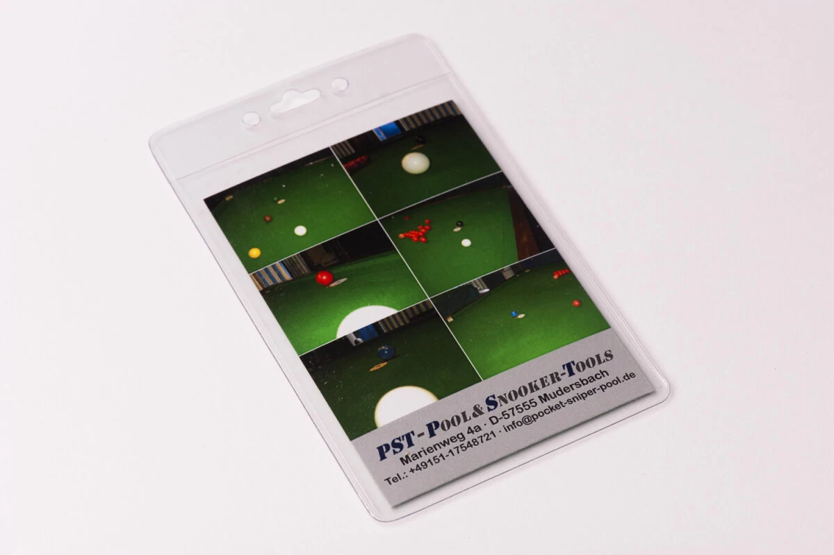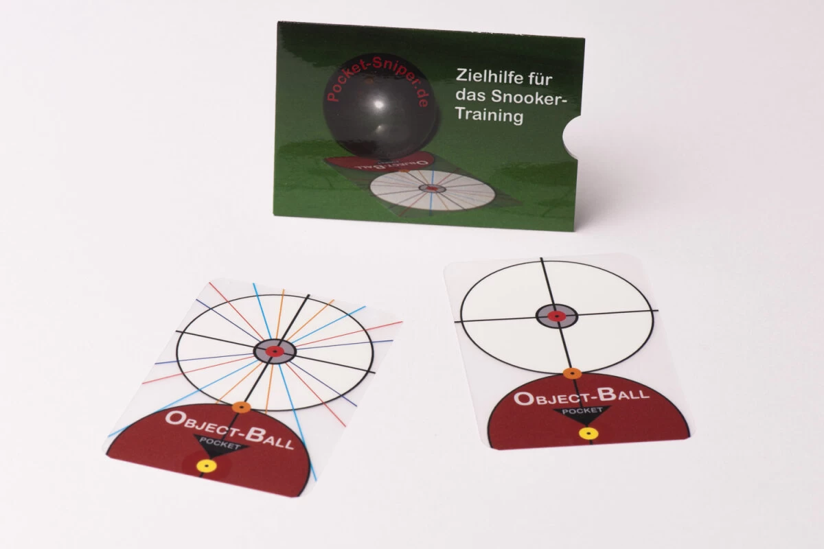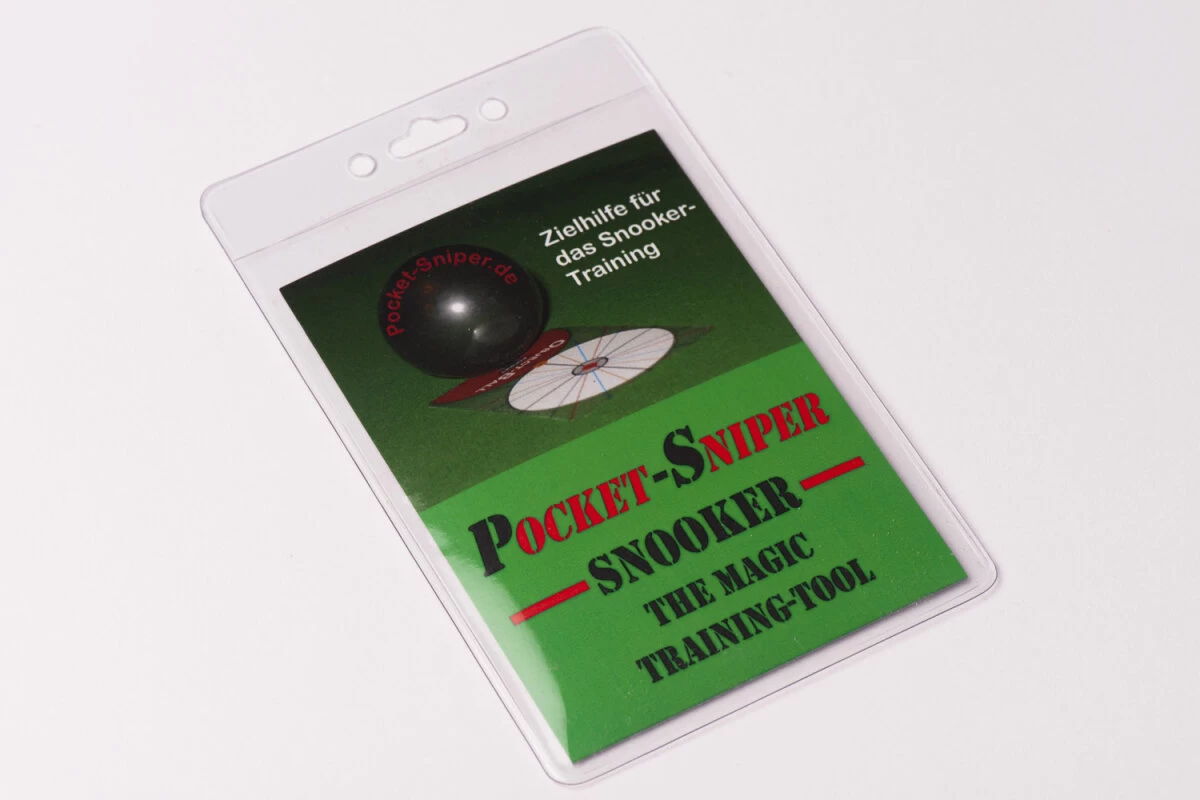 Der Pocket Sniper Pro hilft Ihnen, den Geisterball fĂĽr jeden StoĂź sehen zu lernen. Es handelt sich um eine sehr dĂĽnne Plastikfolie, auf der Objektball und Spielball aufgedruckt sind. Wenn Sie einen neuen StoĂź ĂĽben, legen Sie den Pocket Sniper auf den Tisch auf und bekommen so den Geisterball – Ihr Ziel – genau angezeigt. Das kurze Video unten erklärt das Konzept besser als jeder Text.